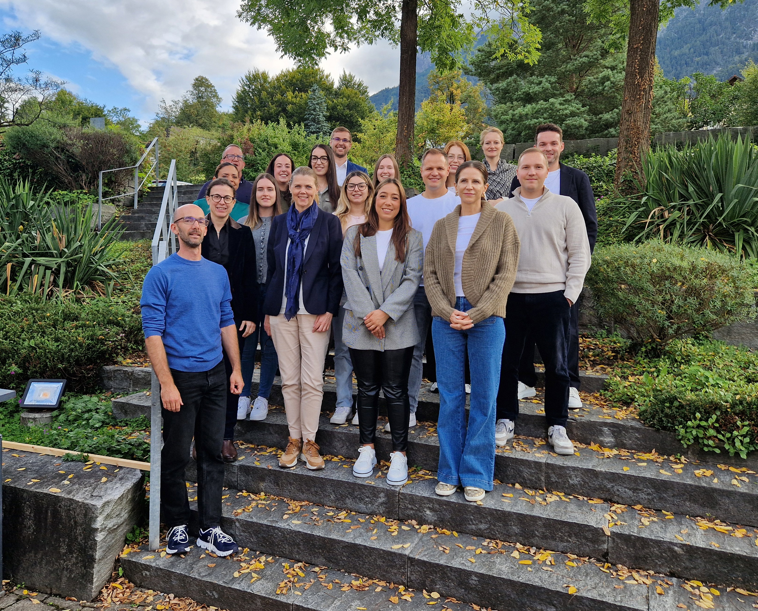 Gruppe von Erwachsenen steht auf Treppe in grüner Umgebung.