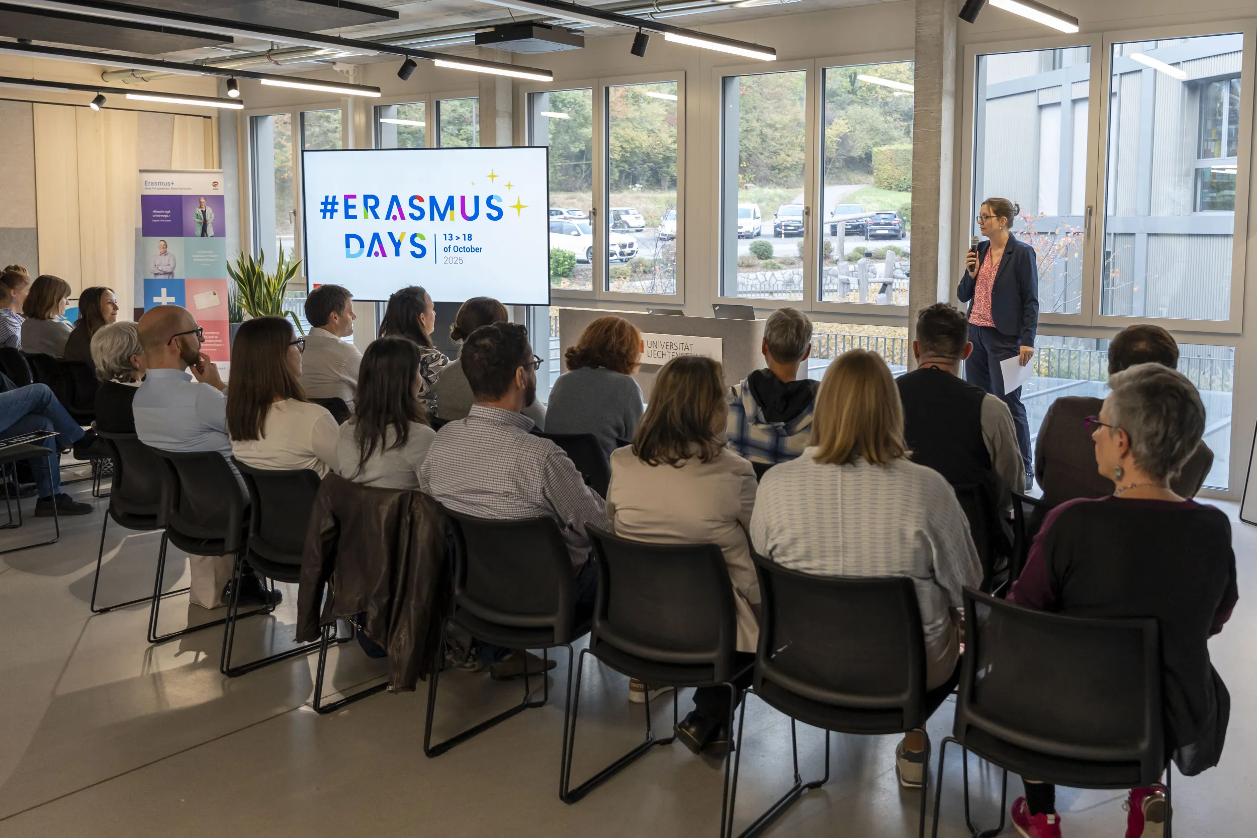 Am Donnerstag, 16. Oktober 2025, lud die Universität Liechtenstein gemeinsam mit der Agentur für Internationale Bildungsangelegenheiten (AIBA) zu einer gut besuchten Veranstaltung im Rahmen der Erasmus+ Days ein. Rund 50 Gäste informierten sich in der Aula am Standort Ebaholz über aktuelle Erasmus+-Projekte und Mobilitätsinitiativen aus Liechtenstein.