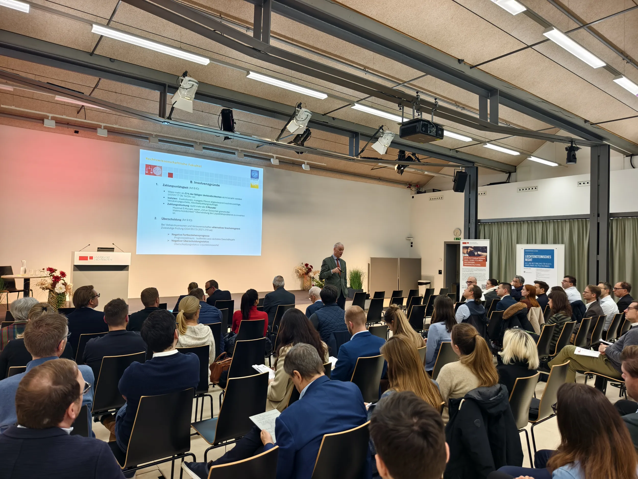 Am 4. Dezember 2025 lud die Professur für Gesellschafts-, Stiftungs- und Trustrecht im Rahmen des gleichnamigen Executive Master of Laws (LL.M.) zu einem Themenabend mit dem Titel «Drohende Insolvenz, aussergerichtliche Sanierungsversuche und Haftungsgefahren bei der Verbandsperson» in das Auditorium der Universität Liechtenstein ein. Vor rund fünfzig Teilnehmenden referierte RA Univ.-Prof. Dr. Hubertus Schumacher, Präsident des Fürstlichen Obersten Gerichtshofs, über Besonderheiten des liechtensteinischen Insolvenzrechts und teilte exklusiv seine praktischen Erfahrungen.