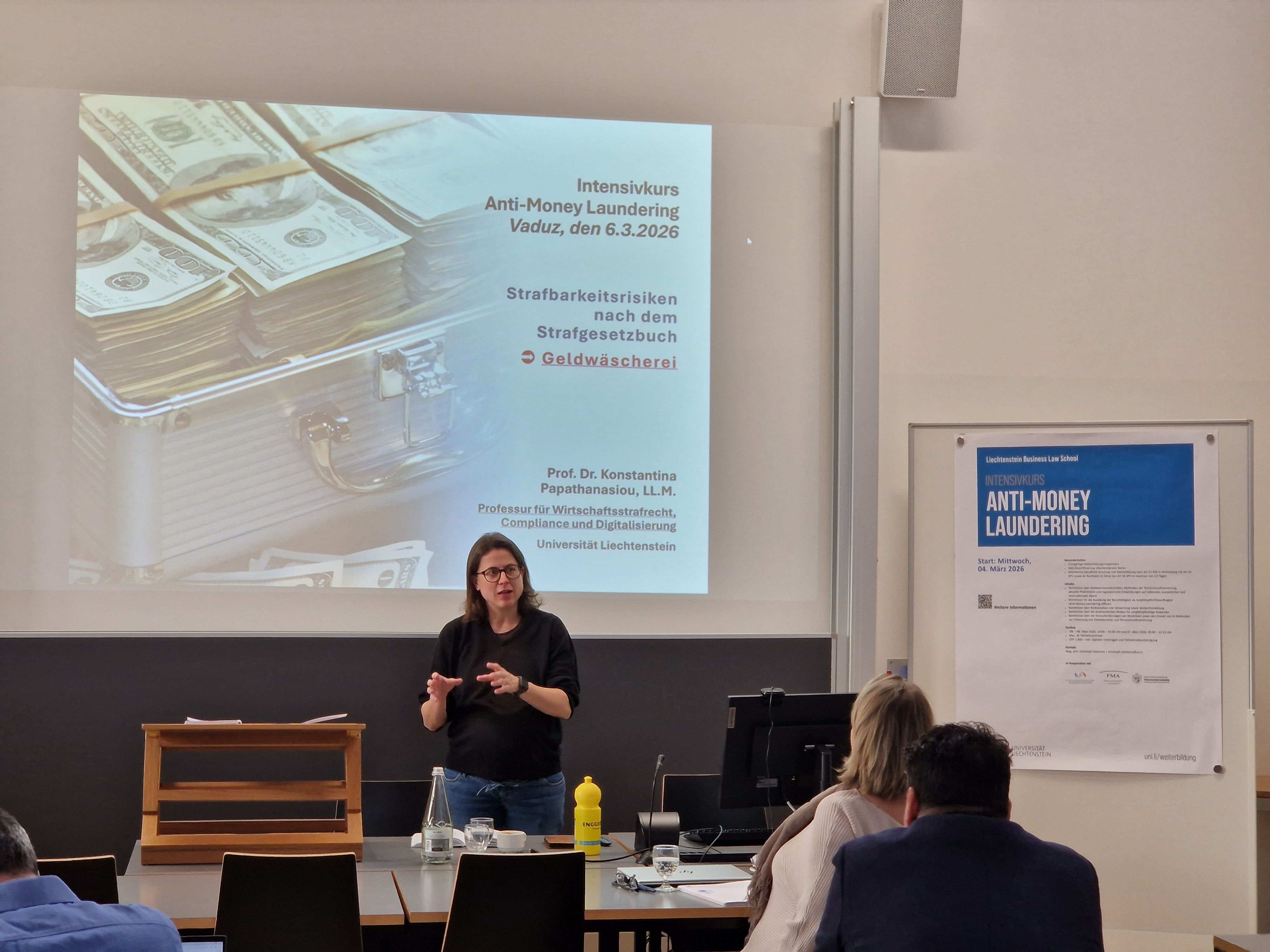 Ein Kernstück des viertägigen Kurses bildeten die strafrechtlichen Risiken. Praktiker des Fürstlichen Landgerichts und der Landespolizei beleuchteten die Strafbestimmungen des Sorgfaltspflichtgesetzes (SPG) und nahmen die Teilnehmenden mit auf eine «Tour d’horizon» aus Sicht der Ermittler. Kursleiterin Prof. Dr. Konstantina Papathanasiou, Inhaberin der Professur für Wirtschaftsstrafrecht, Compliance und Digitalisierung, vertiefte zudem das Unternehmensstrafrecht sowie den Kern-Paragrafen 165 zur Geldwäscherei im Strafgesetzbuch.