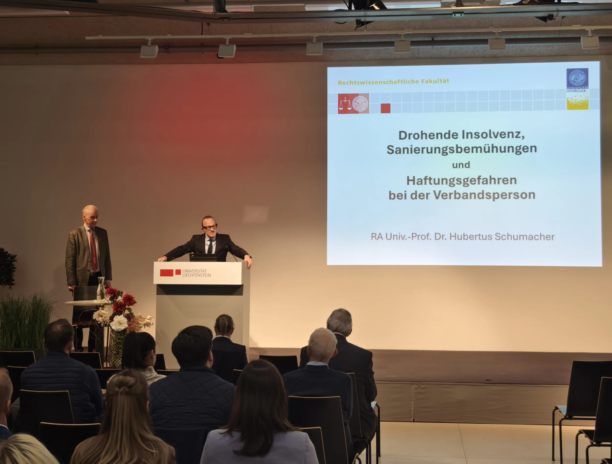 Am 4. Dezember 2025 lud die Professur für Gesellschafts-, Stiftungs- und Trustrecht im Rahmen des gleichnamigen Executive Master of Laws (LL.M.) zu einem Themenabend mit dem Titel «Drohende Insolvenz, aussergerichtliche Sanierungsversuche und Haftungsgefahren bei der Verbandsperson» in das Auditorium der Universität Liechtenstein ein. Vor rund fünfzig Teilnehmenden referierte RA Univ.-Prof. Dr. Hubertus Schumacher, Präsident des Fürstlichen Obersten Gerichtshofs, über Besonderheiten des liechtensteinischen Insolvenzrechts und teilte exklusiv seine praktischen Erfahrungen.